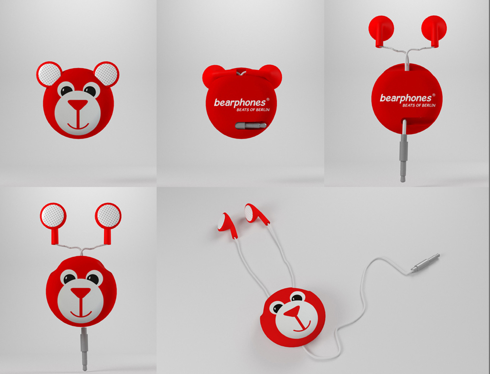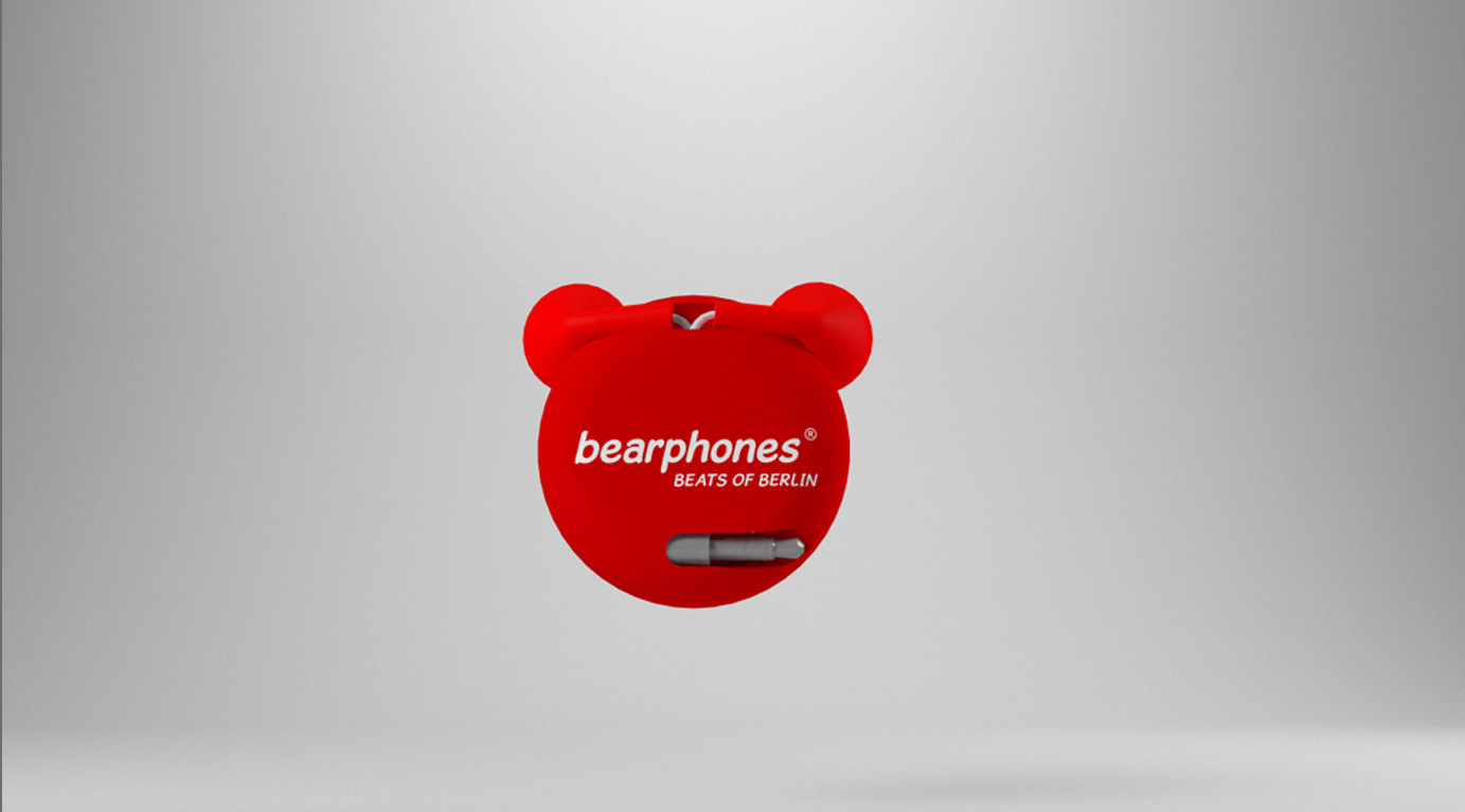 Die »bearphones« – das sind lustige Earphones im bärigen Design Aufrollbare In-Ohr-Kopfhörer in Form des Berliner Bären. Auf der Rückseite ist der Name »bearphones« mit dem Zusatz »Beats of Berlin« aufgedruckt. Der Name ist eine verspielte Kombination von Earphones und Bear – »bearphones«.