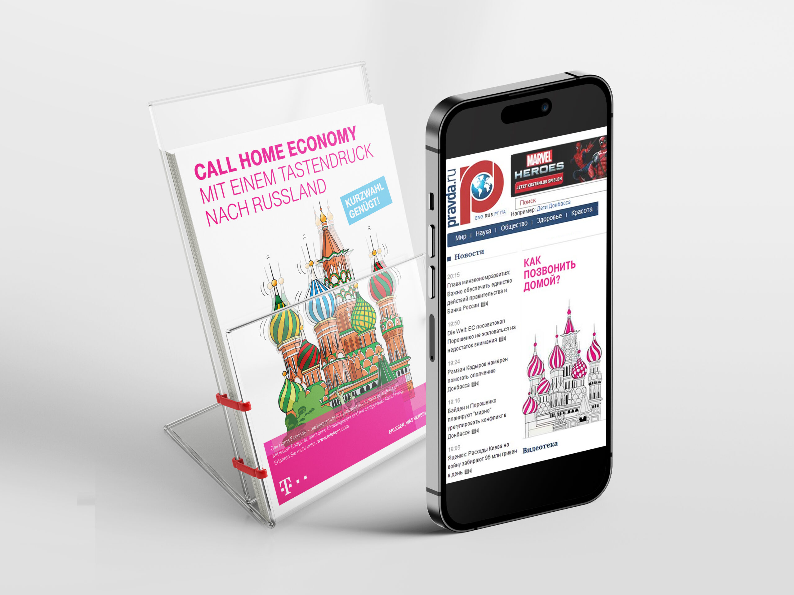 Für die in Deutschland lebenden russischen Mitbürgern wird kommuniziert dass es einen neuen Tarif von der Telekom gibt, mit dem sie bequem nach Hause in die Heimat telefonieren können. Das bekannte Wahrzeichen von Moskau, die Zwiebeltürme, werden zum Klingeln gebracht.