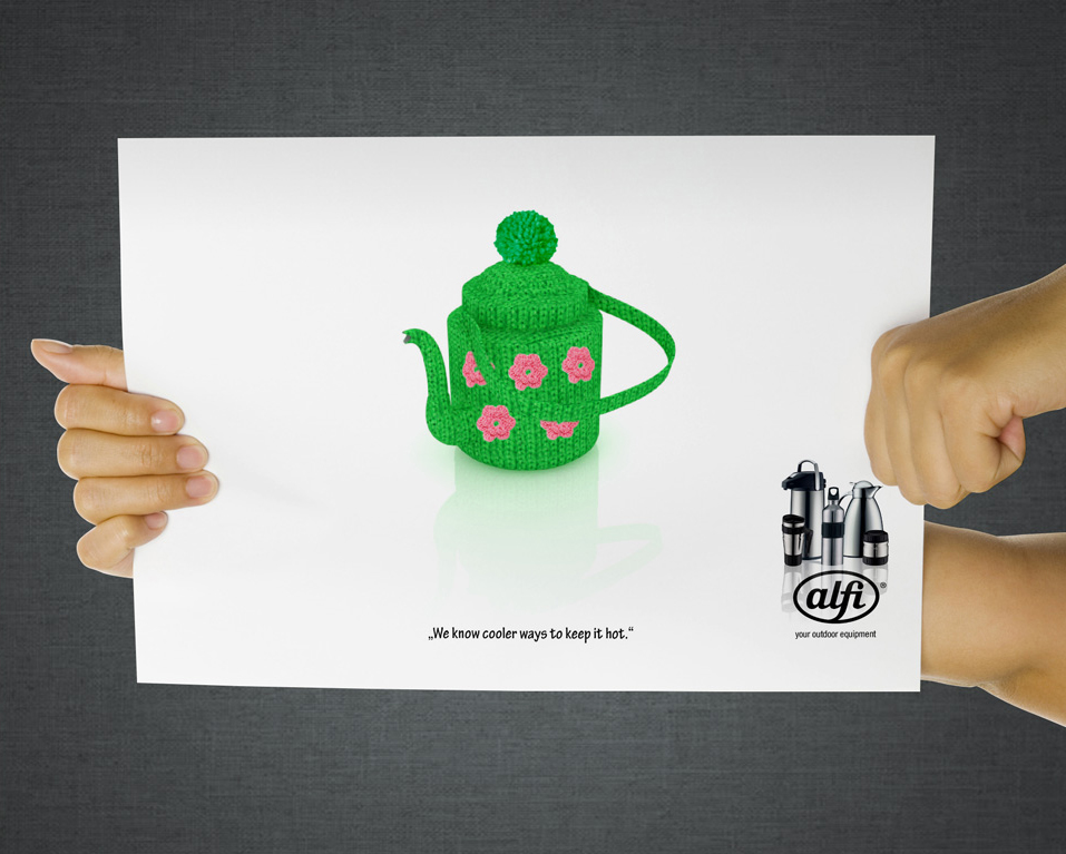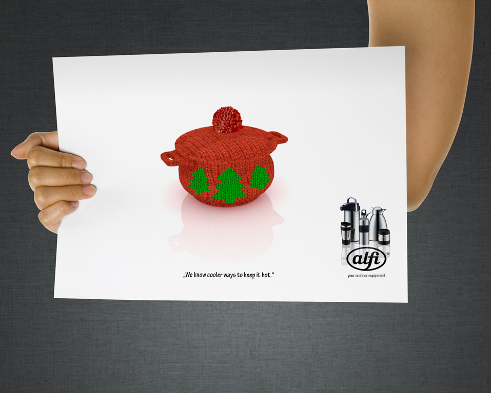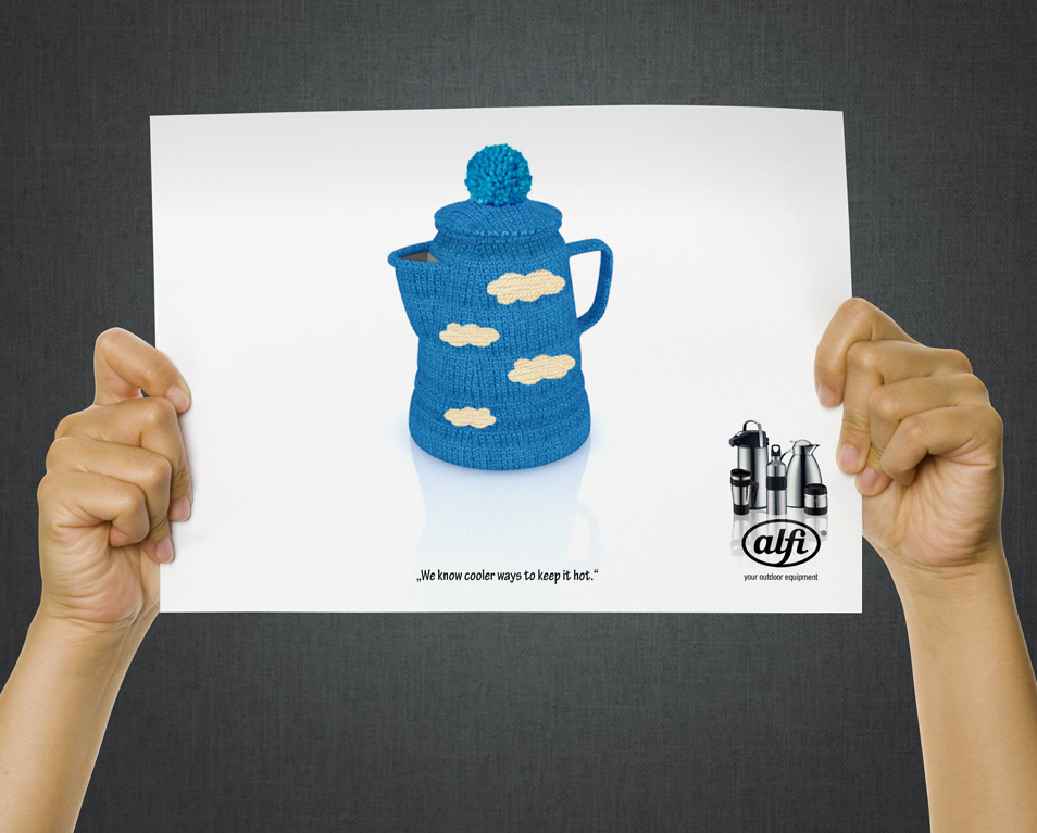 Gestaltung einer Kampagne für Outdoor-Isolierkannen. Handelsübliches Geschirr und Kannen, überzogen mit Mützen, die zeigen dass es eine bessere Lösung gibt – dank alfi – und stellen so den Benefit heraus.