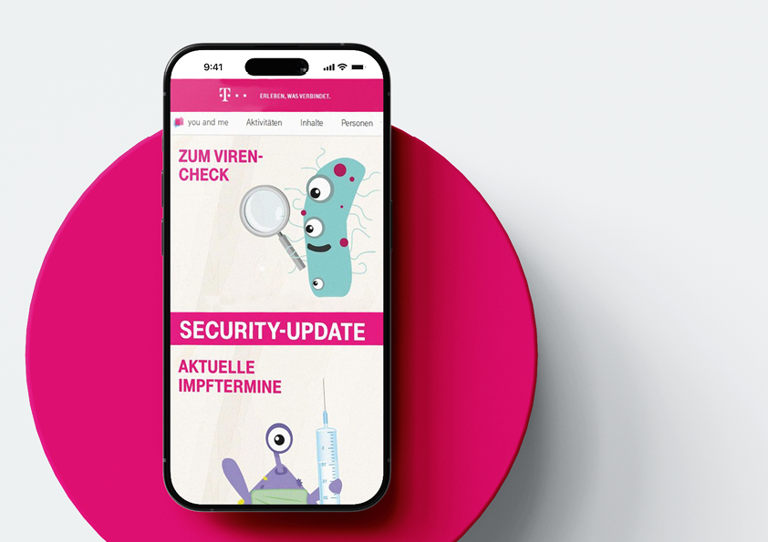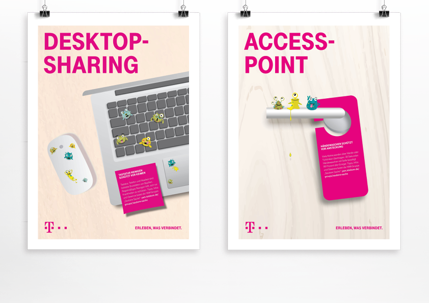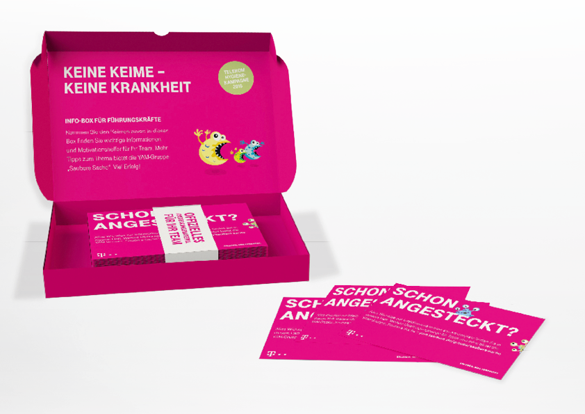 Bei der Telekom erkranken die Mitarbeiter meist in der kalten Jahreszeit. Um einen möglichen Ausfall vorzubeugen wurde die Hygienekampagne ins Leben gerufen, die über Infektionswege und deren Vermeidung informiert. Dazu gehören eine Plakatserie und eine Infobox mit Broschüren.