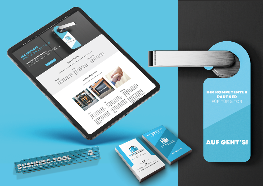 Gestaltung eines Corporate Designs für ein Unternehmen mit dem Fachgebiet Tür- und Tortechnik. Die Initialien des Geschäftsführers dienen als Grundlage für die Logogestaltung von der sich das Corporate Design ableitet. Und was nicht fehlen darf: der dezente Humor in der Kommunikation.