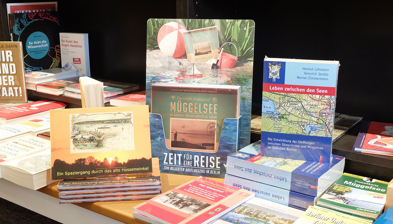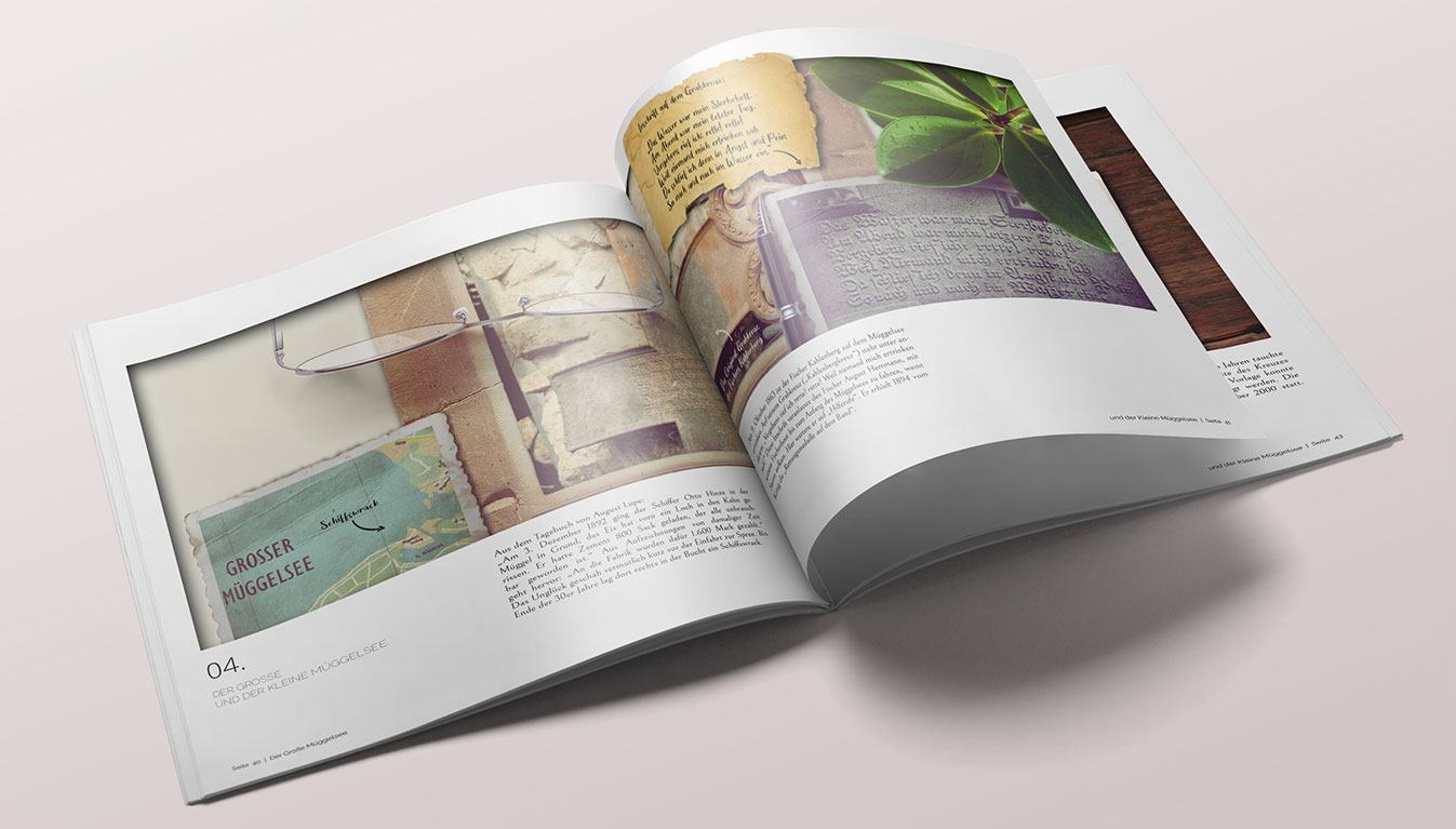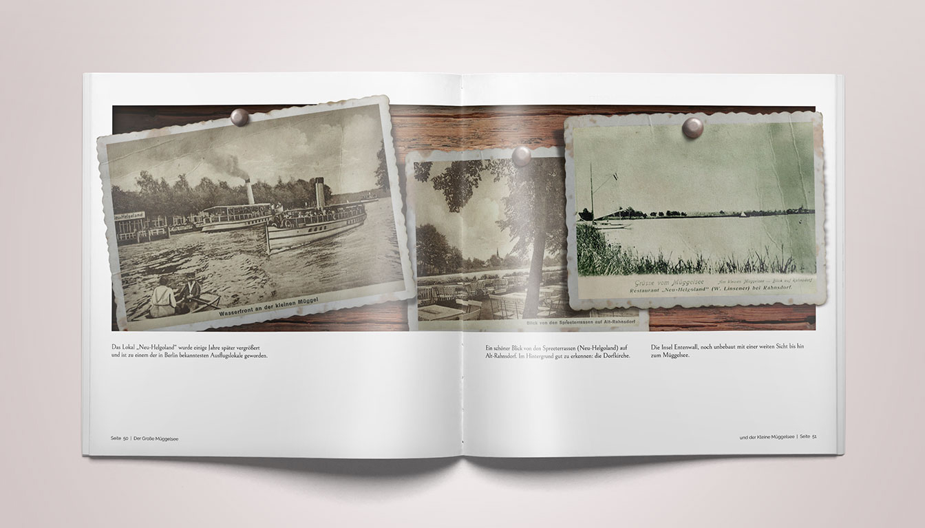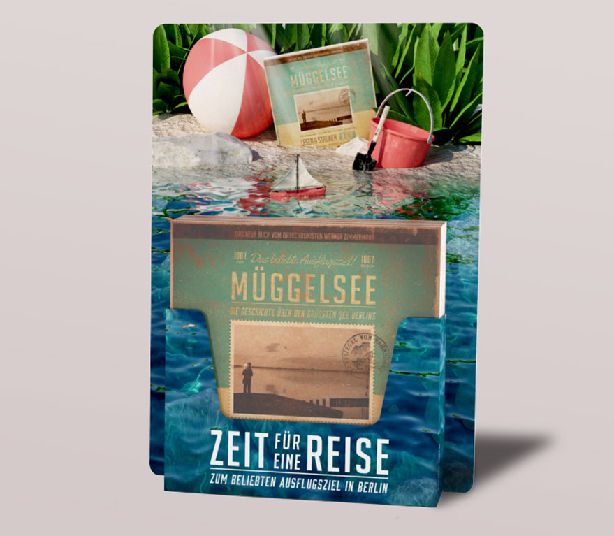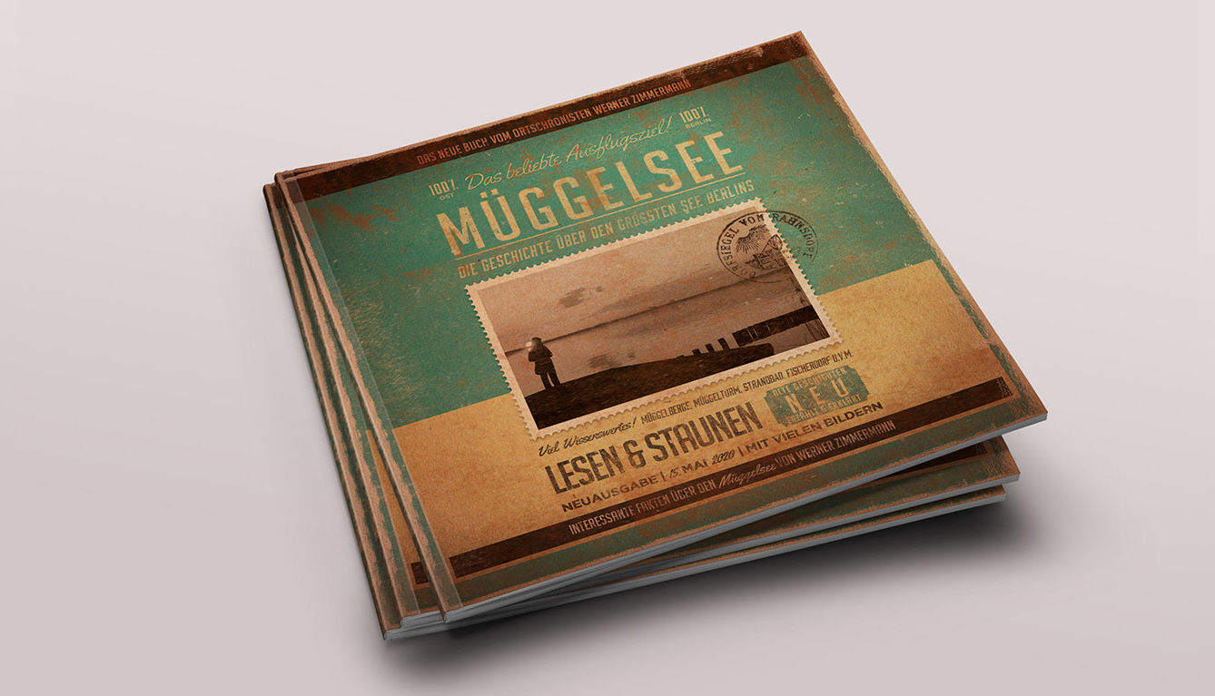 Gestaltung eines Buches über den Müggelsee, mit Dispenser und Plakat. Das Layout erhält einen nostalgischen Look.
